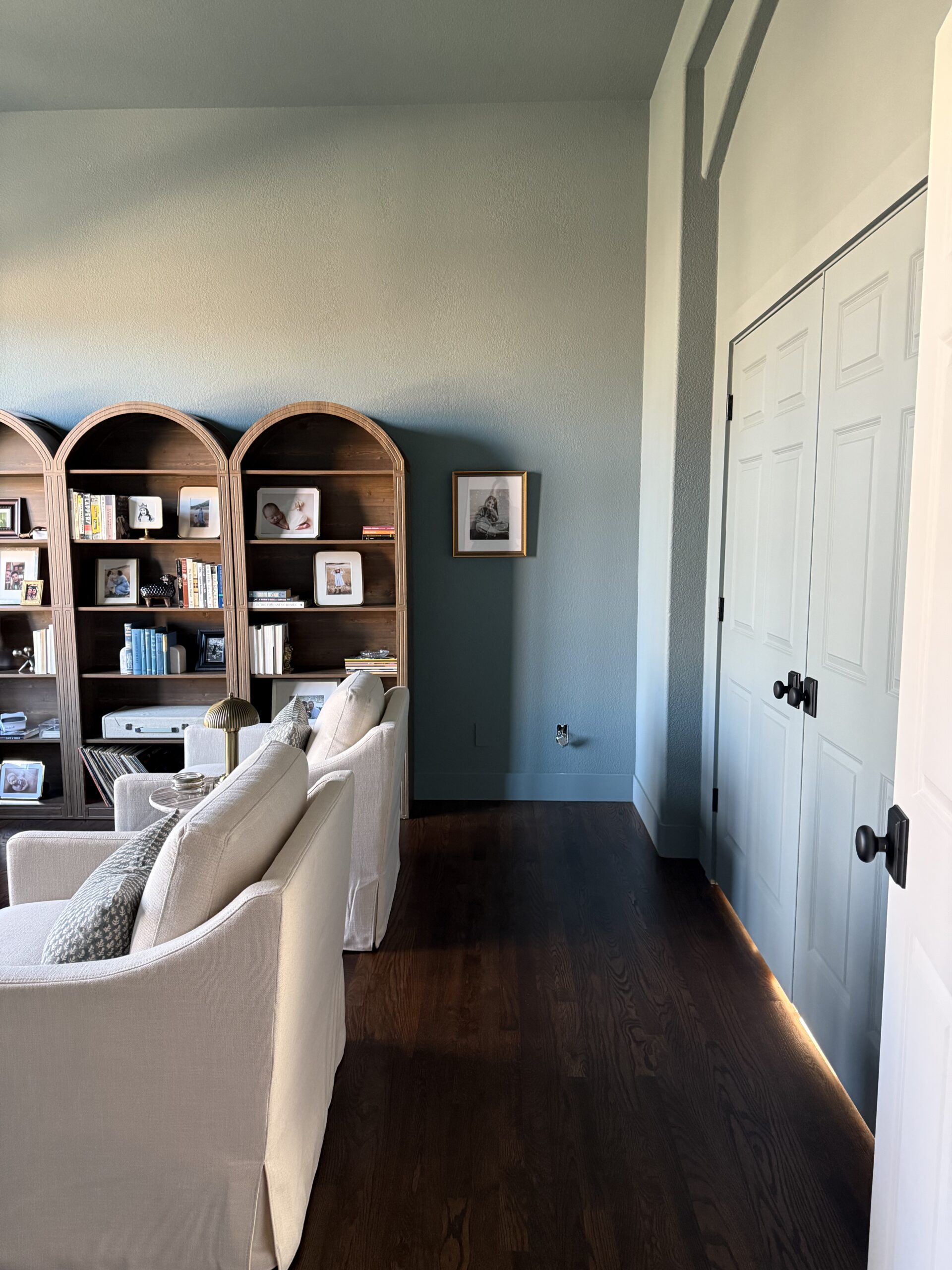 During planning, we talked through how color could shape the feel of different rooms. The library and bedroom became great opportunities to introduce a color drench approach, which uses the same color across walls and surrounding surfaces to create a rich and immersive effect. The remaining rooms were kept lighter with Shoji White to balance the darker feature areas. Once the plan was finalized, the project moved quickly and smoothly over the four-day schedule.